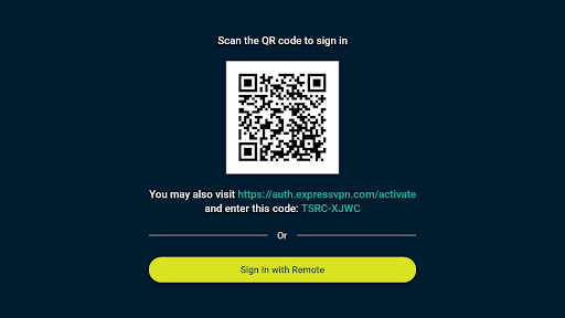ExpressVPN Android TV VPN app QR code sign-in method.